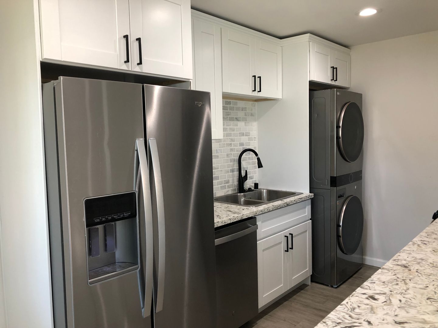 The kitchen has granite counters, custom backsplash, upgraded cabinets and fixtures. The stainless steel appliance package includes a refrigerator, dishwasher, stove/oven and washer/dryer. There is a small bar stool counter.