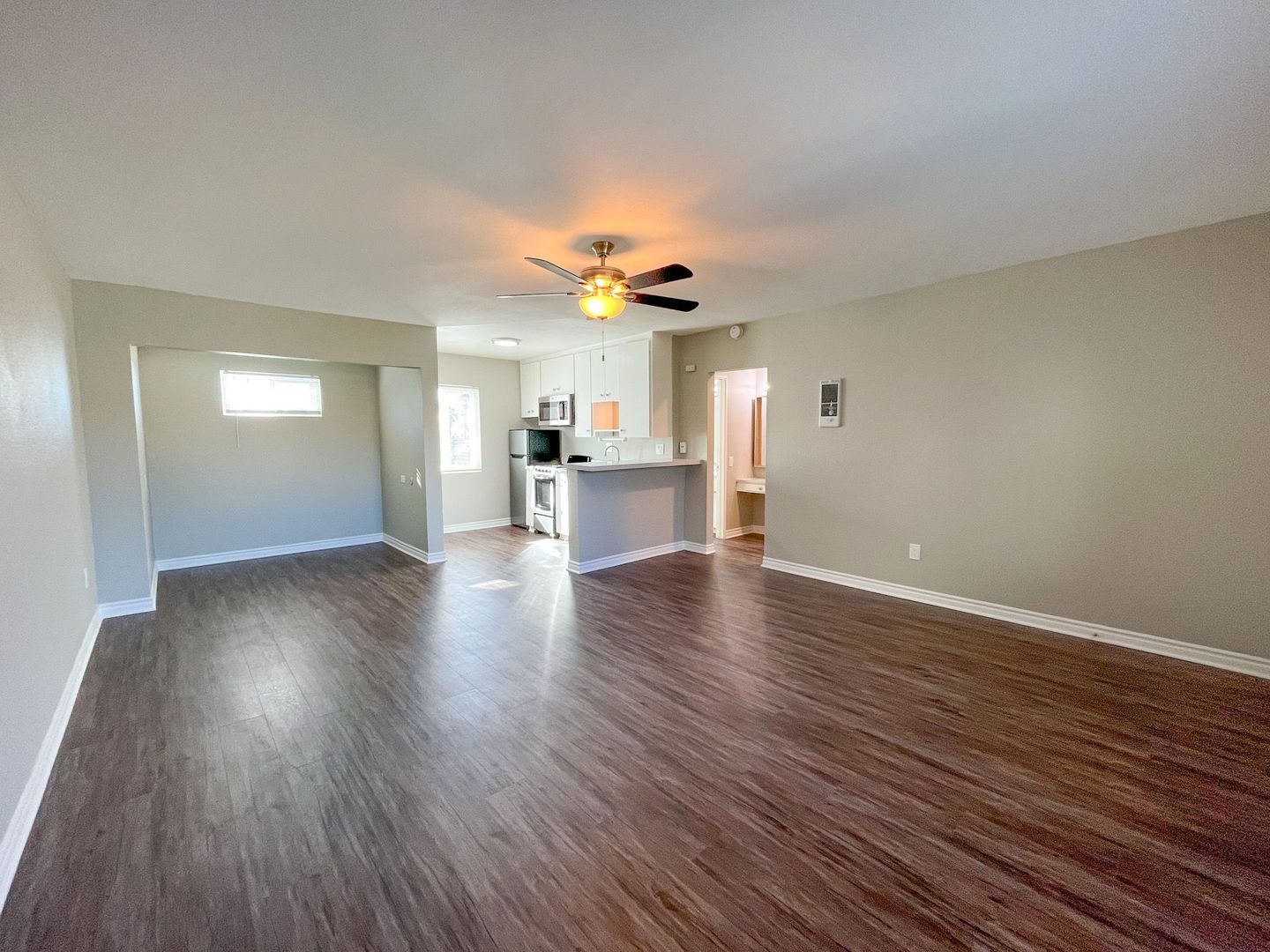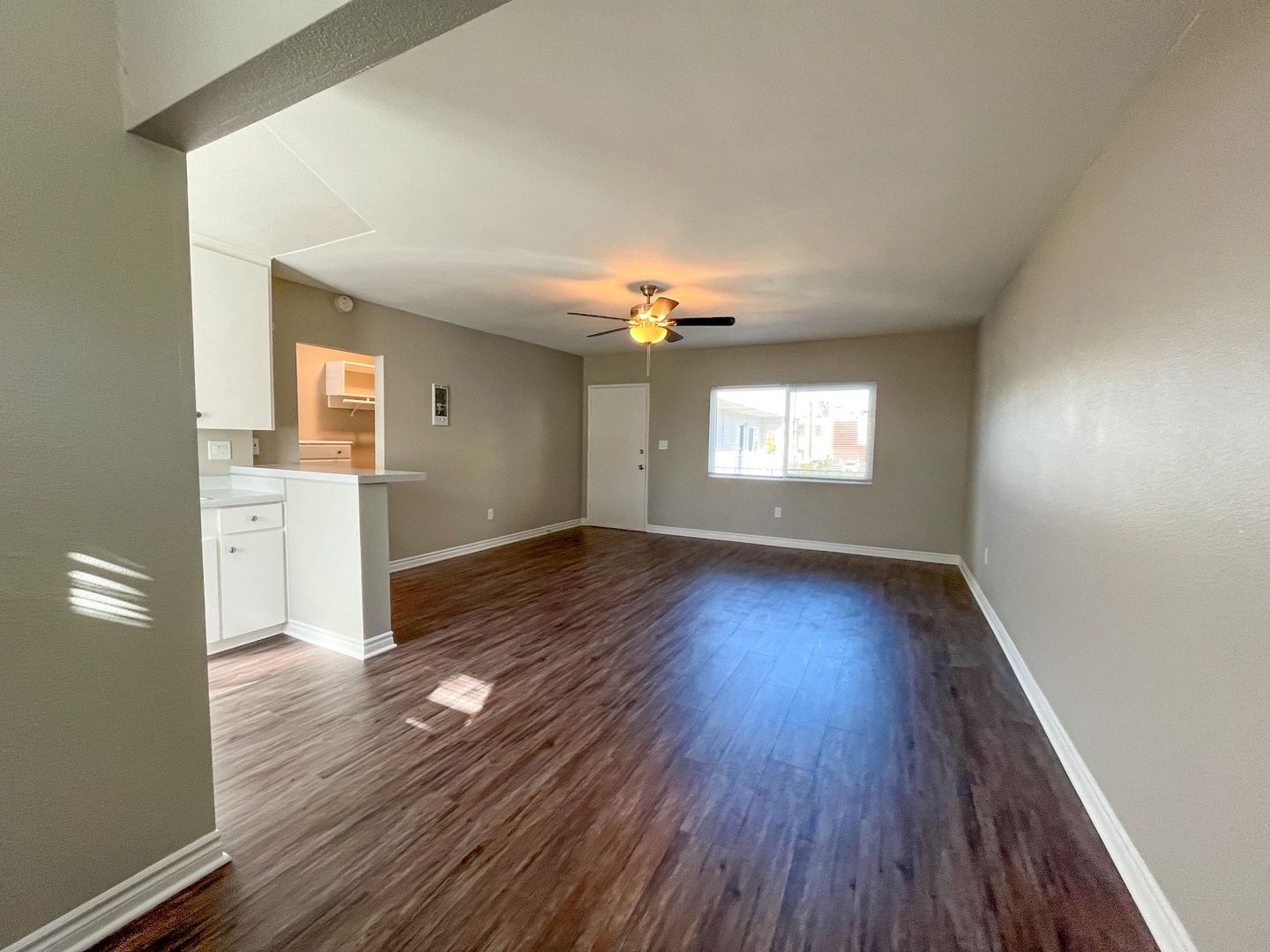 If you want to live close enough to walk to the beach this is your opportunity to join the Villa Pacific community. As you enter you will find vinyl plank flooring throughout the entire floor plan of this large studio apartment. Accented with a warm paint color throughout. The main living space offers a ceiling fan and electric heat. Along one wall you will find newly installed USB ports for your convenience.