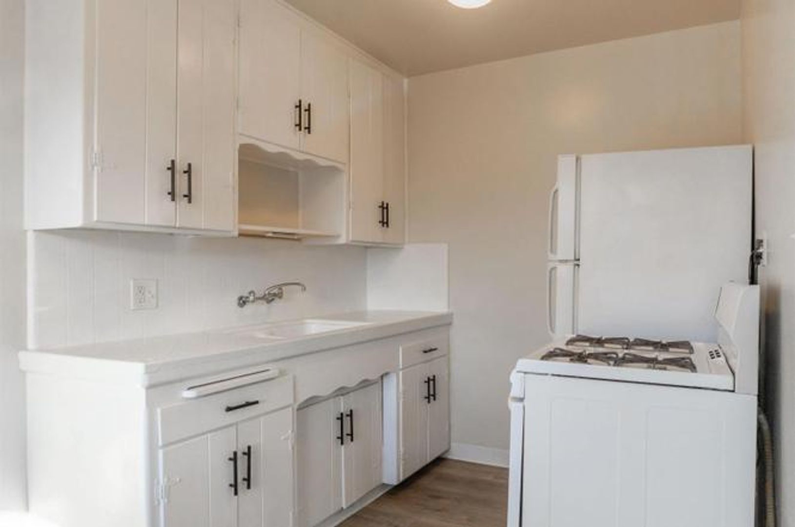 We are pleased to present this freshly updated light and airy 1 bedroom apartment. The kitchen includes a new refrigerator and stove and has a small nook perfect for a table and chairs. The home includes chic vinyl flooring in kitchen and bath, and newly installed plush carpet in living room and bedroom. New horizontal blinds in kitchen, living room, dining room and bedrooms complement the double-pane vinyl windows. There is wall heating in the living room as well as a built in A/C unit. The well-appointed bathroom has a tub/shower combo. Enjoy the private patio!