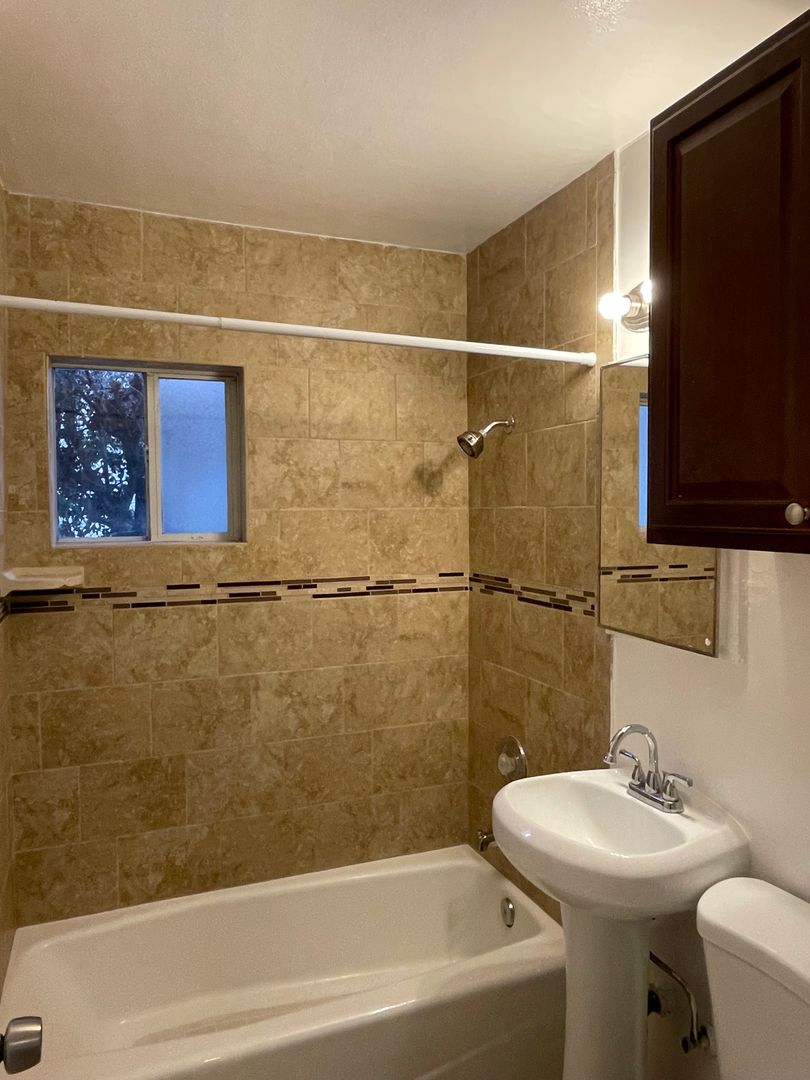 The bathroom boasts a beautifully tiled tub/shower and newer cabinetry to match the updated kitchen for great flow throughout the unit.