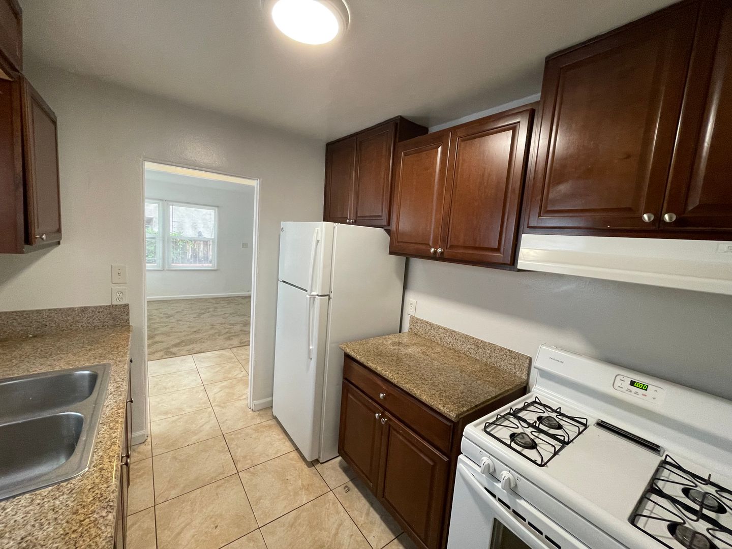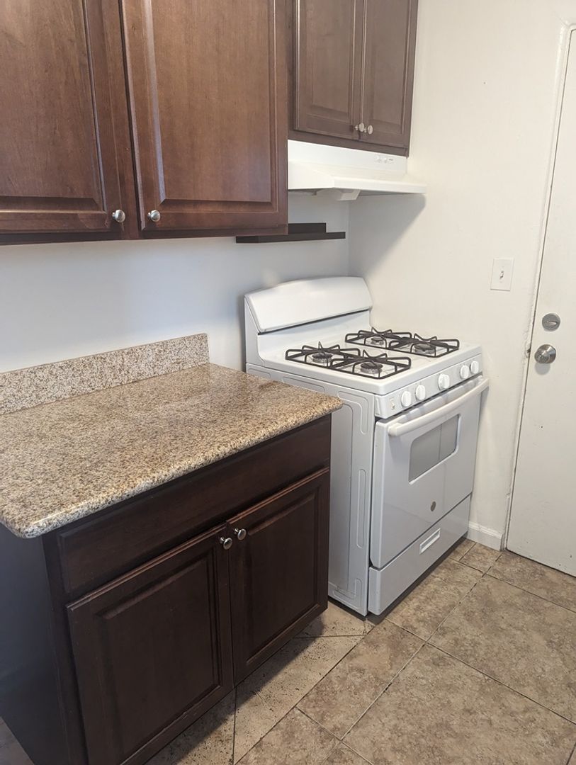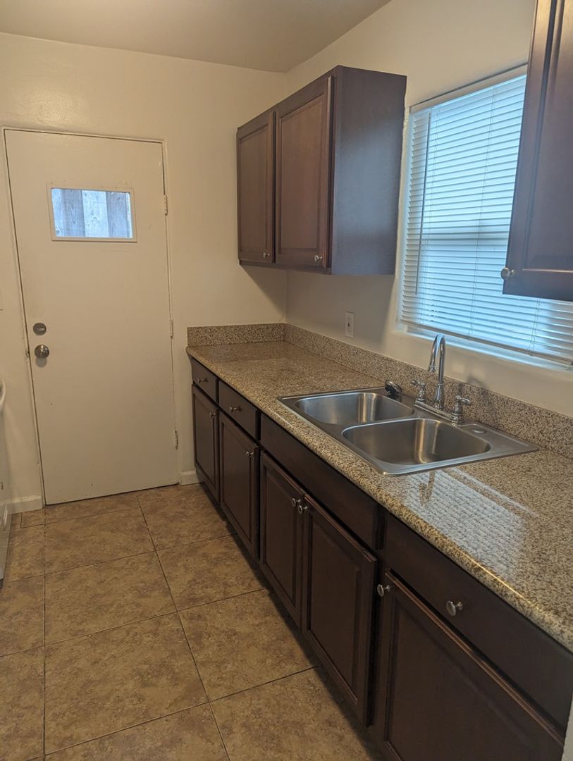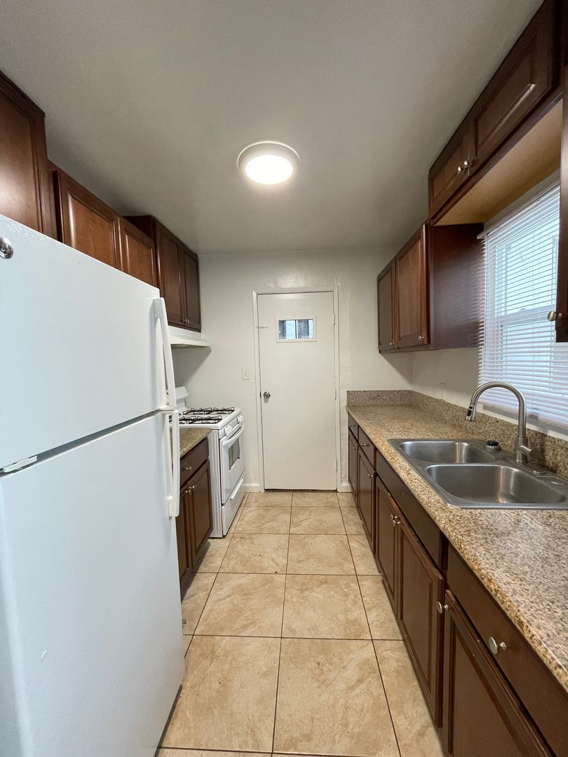 The kitchen includes a refrigerator, gas stove/oven and recently updated cabinets. A door from the kitchen leads to a private fenced in area where you can store surf boards, bikes, beach toys or even utilize a propane BBQ grill.