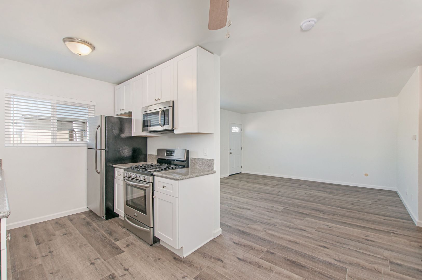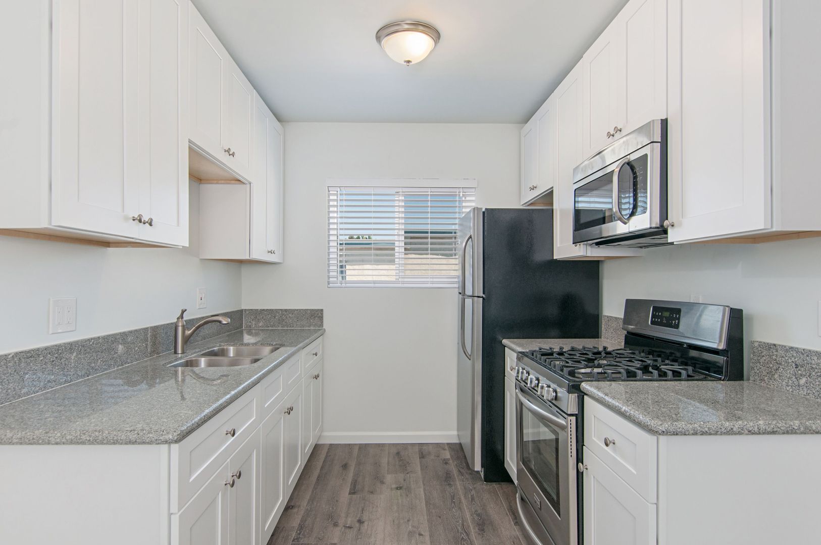 The kitchen offers a deep grey shade of granite counters, abundant cabinets and an appliance package which includes a stainless refrigerator, stove/range and microwave.