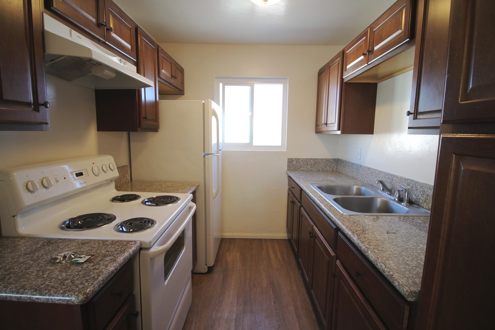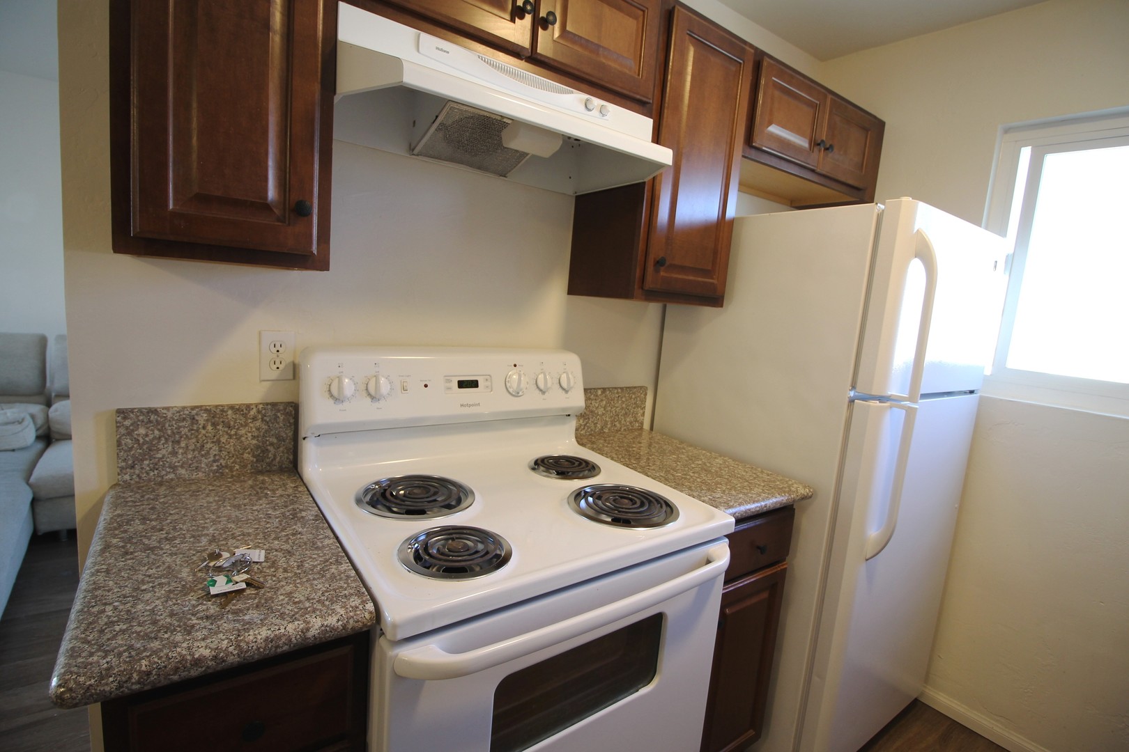 The kitchen offers granite counters, wood cabinets and plank flooring. The appliances include stove/oven and refrigerator. The dining area is adjacent to the kitchen and offers a ceiling fan.
