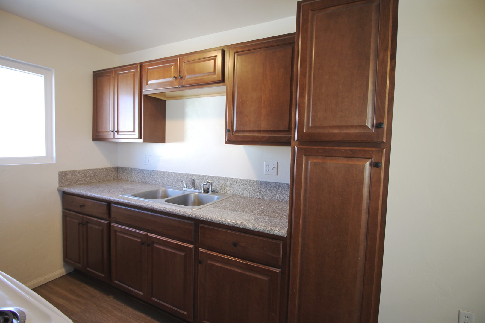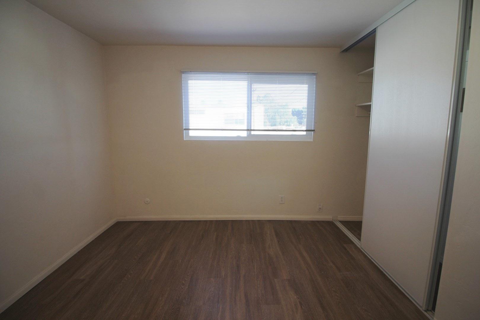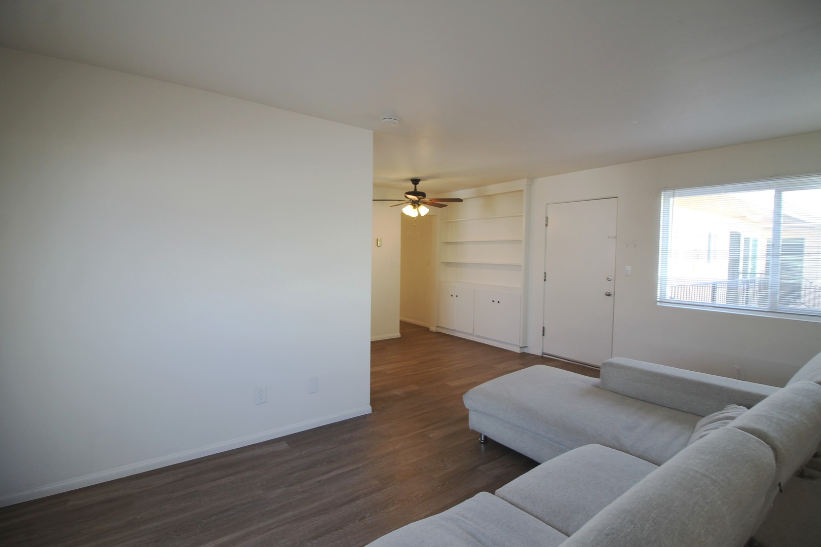Step inside this unit and enjoy the abundant natural light throughout.The living room offers a warm neutral paint color and plank flooring. The living room offers built in shelving; a perfect place to display books, photos and knick knacks.