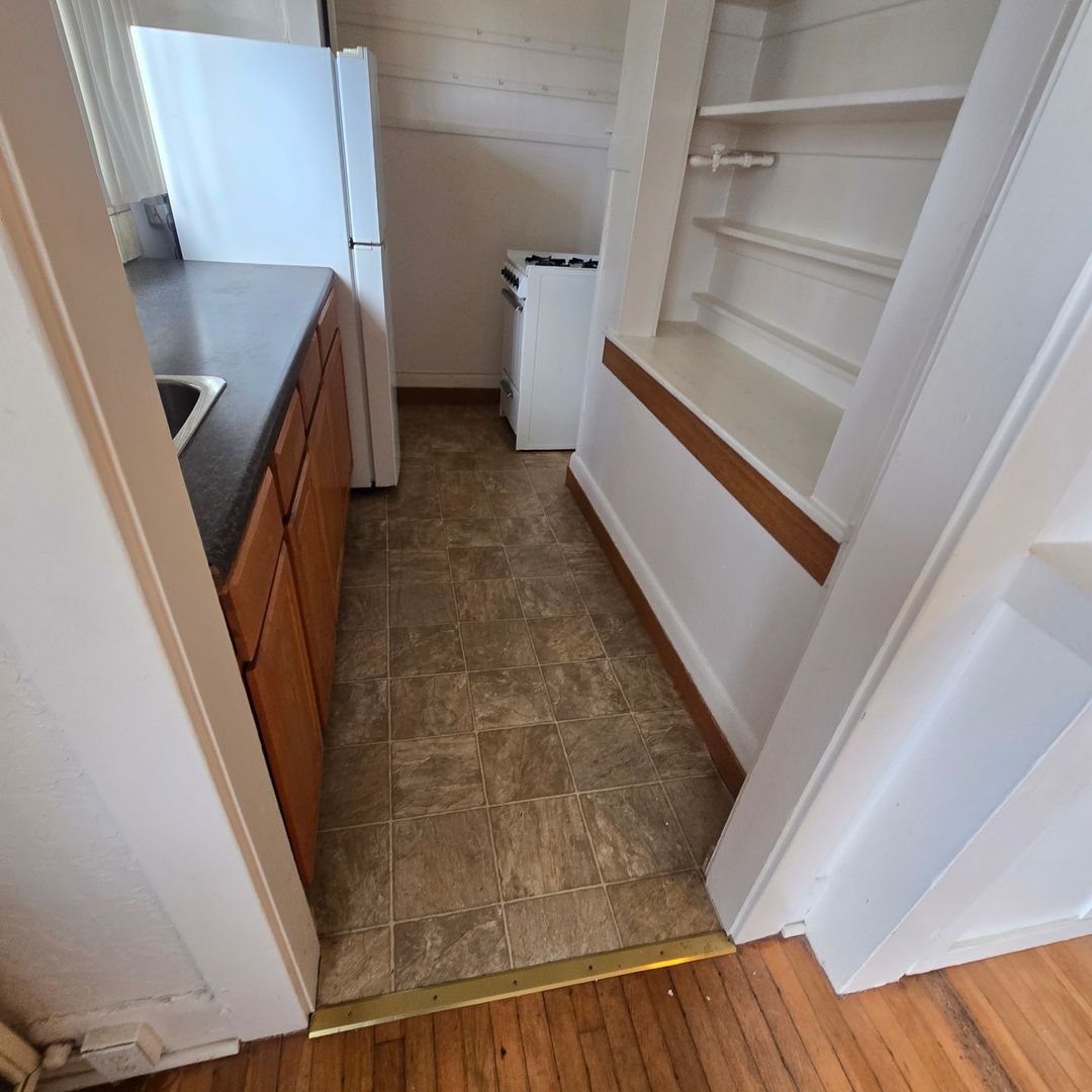 The kitchen offers generous counter space and has built in cabinets. Appliances include a refrigerator and stove.