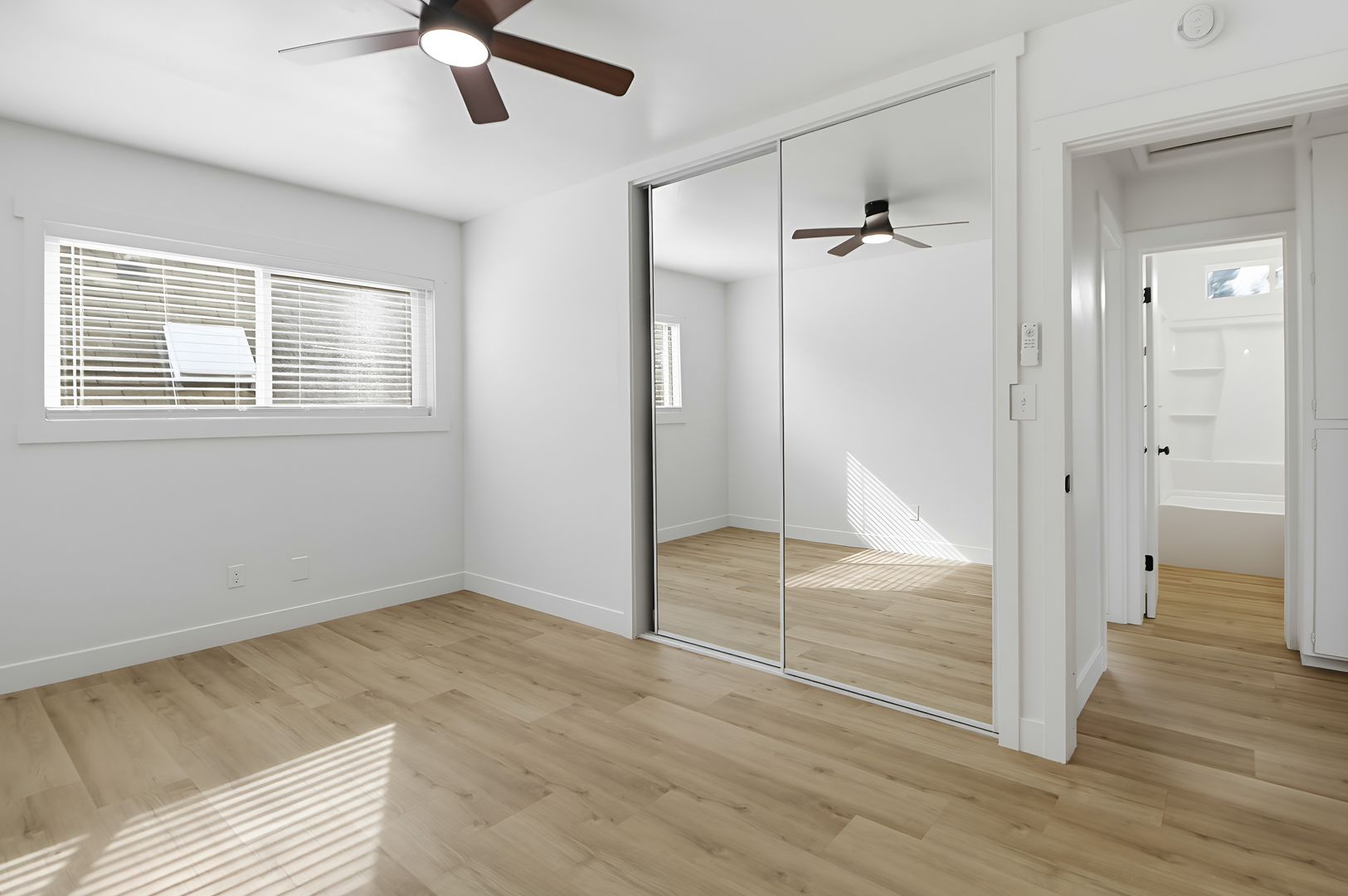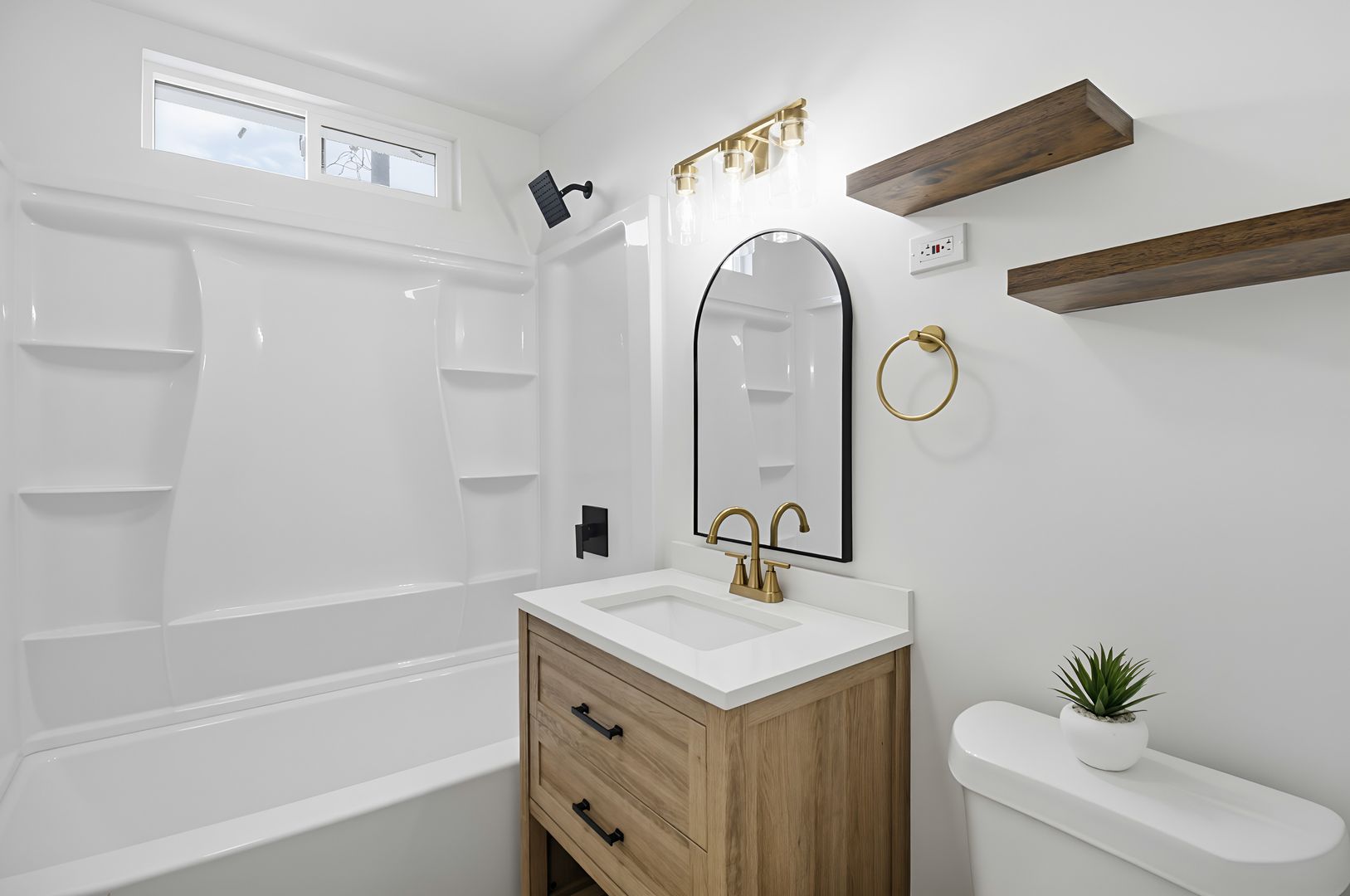The modern feel continues into the bathroom, where you’ll find all new floating wooden shelves, gold-colored accents, a deep tub with built-in shelves and a complimenting wood vanity with square sink.