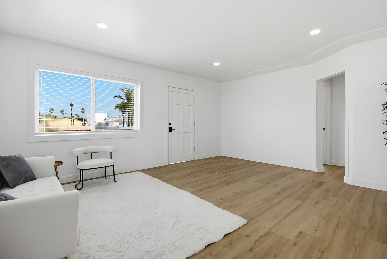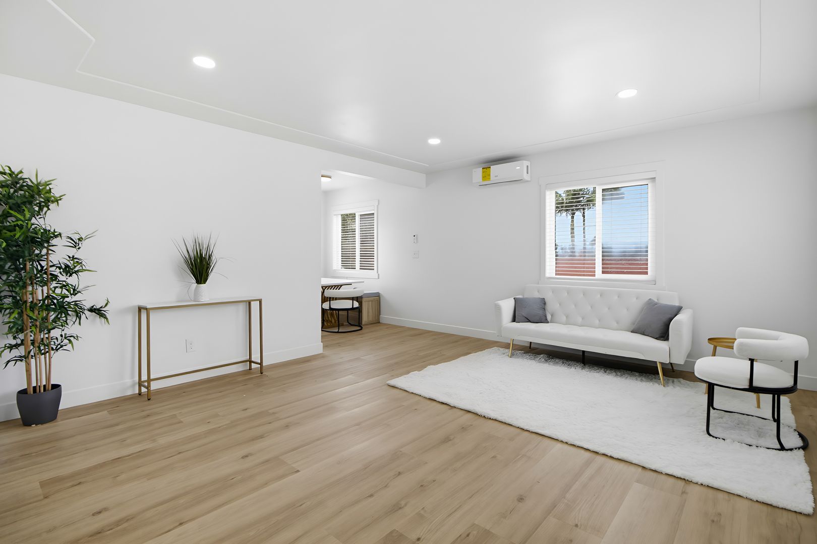 The spacious living room displays a tray ceiling with recessed lighting. The accentuated curved wall leading to the hall is a unique eye catcher. The many windows keep the space brilliant with abundant natural light.