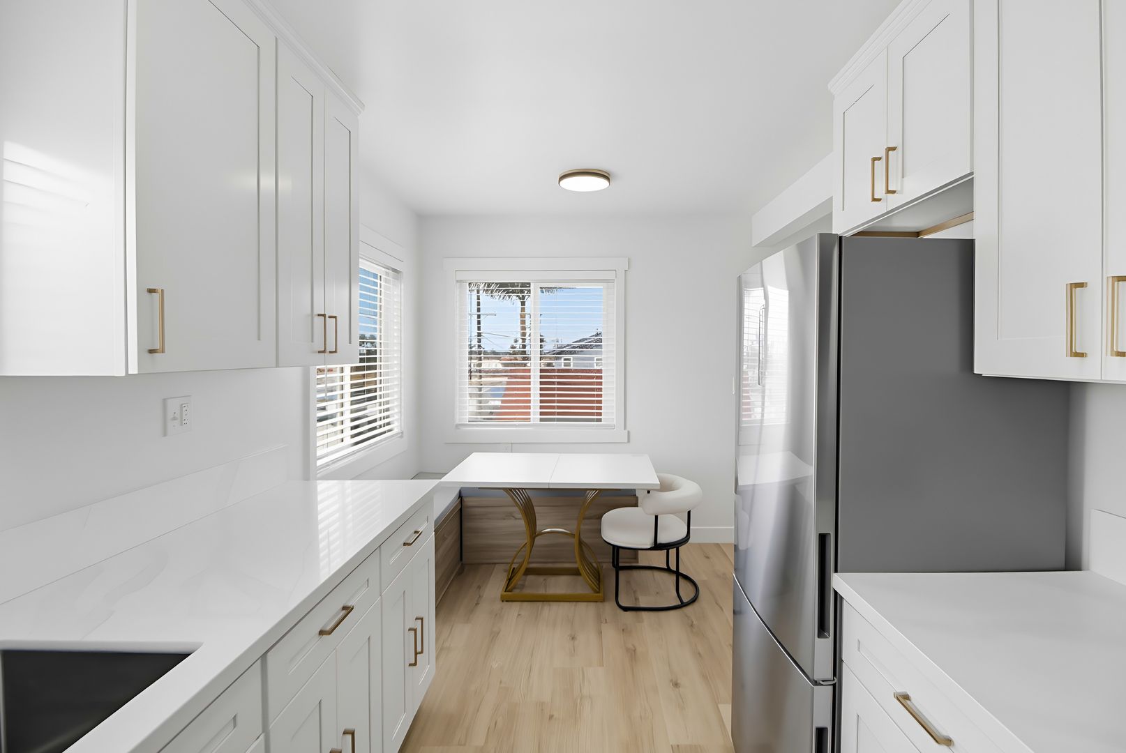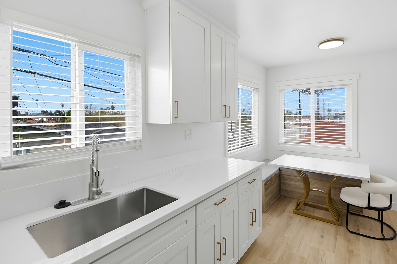 As you make your way to the kitchen you are greeted by elegant countertops complimented by high ceiling cabinetry with an abundance of storage room. The gold-colored hardware adds a clean streamline look. The sink is a deep farmhouse style with a convenient faucet sprayer. All new stainless-steel appliances complete with gas range, refrigerator, and built-in microwave. The spacious dining area is surrounded by two windows, one facing west.
