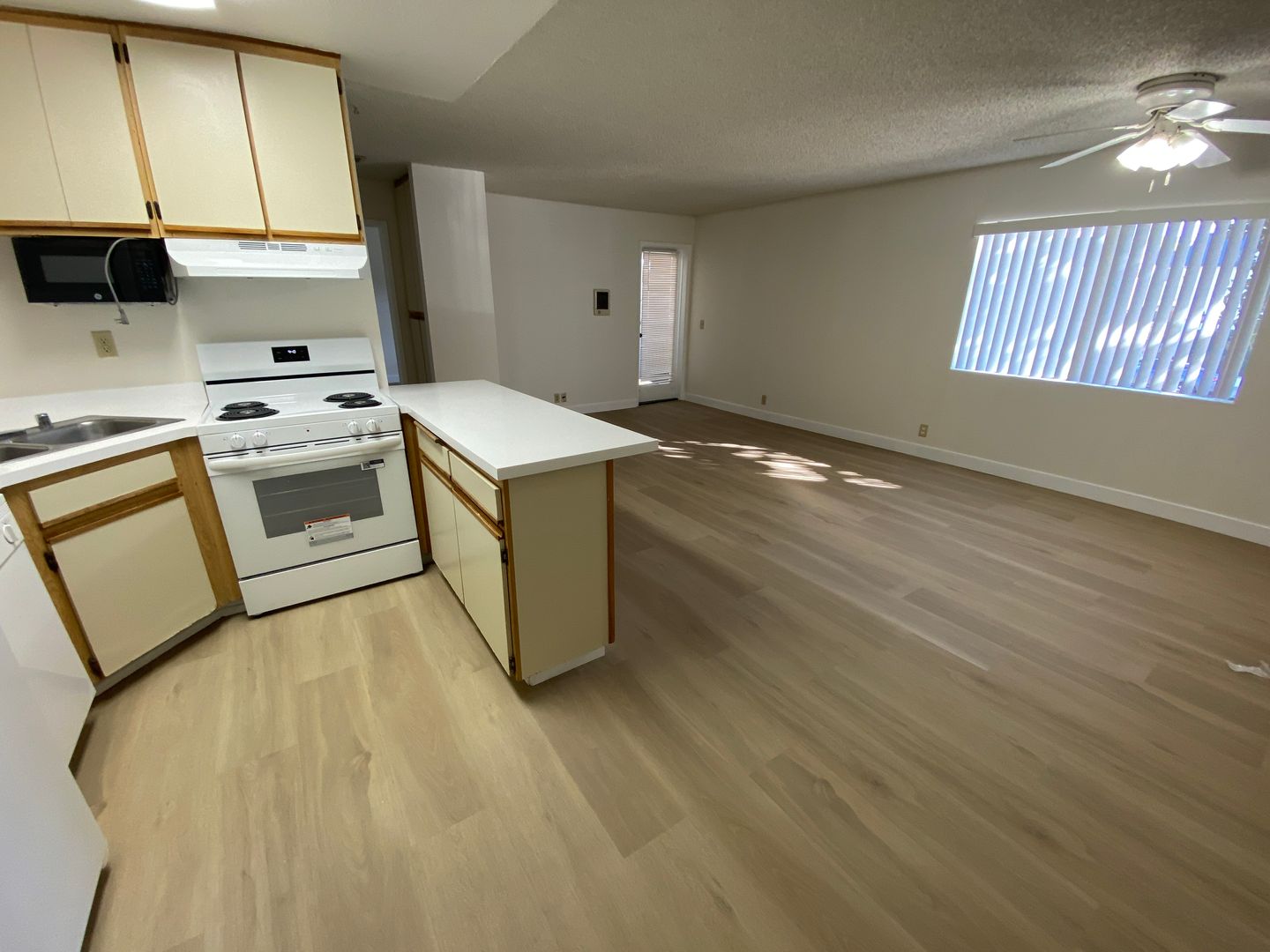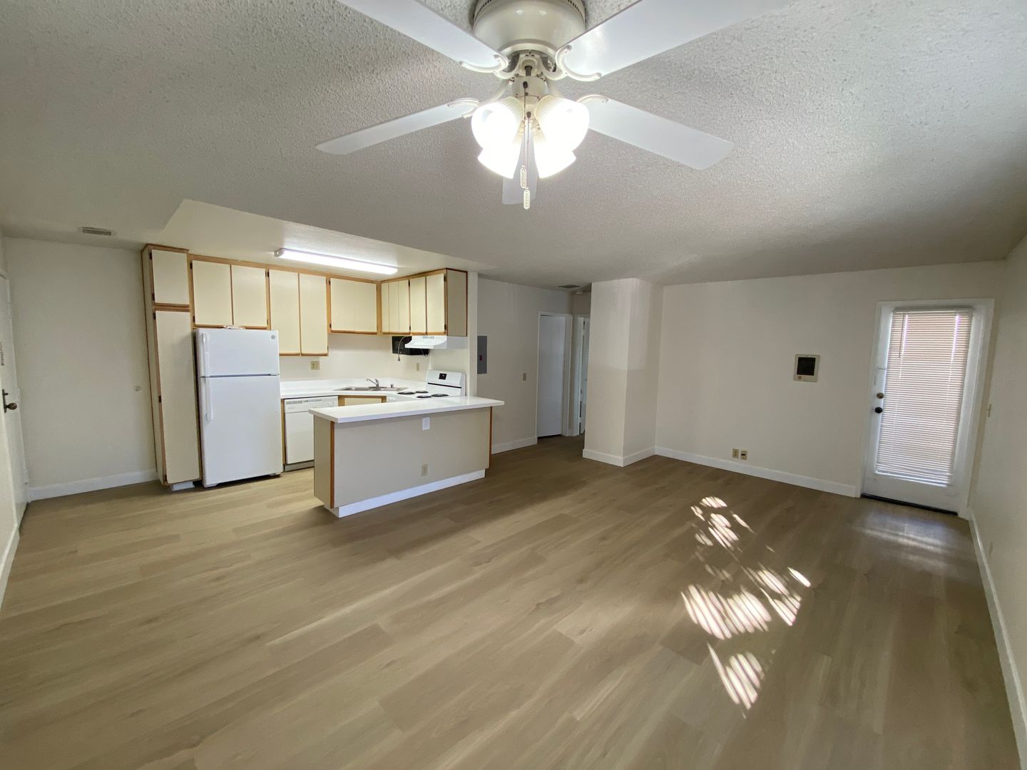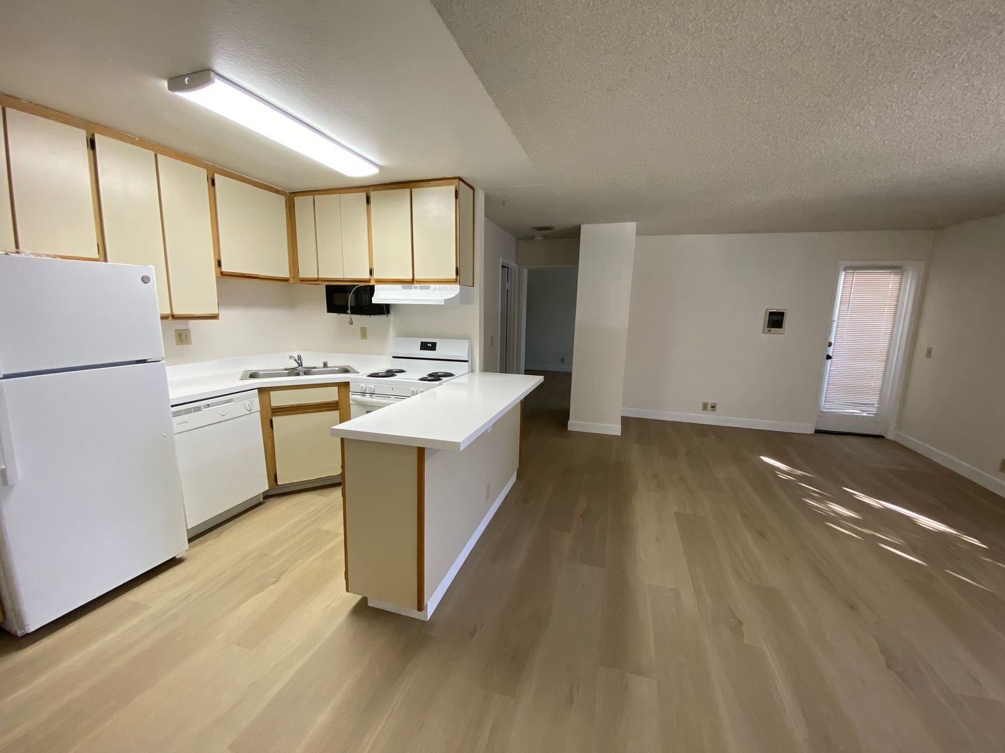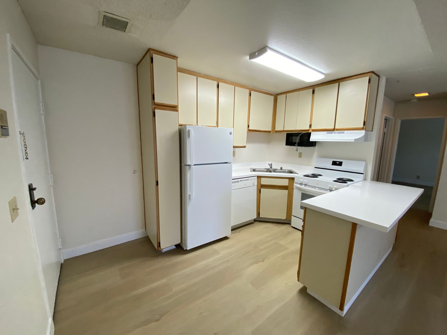 New flooring and paint color throughout the unit are inviting as you enter the living room. The very spacious living room will effortlessly fit over-sized furniture and a large screen TV with much room to spare!