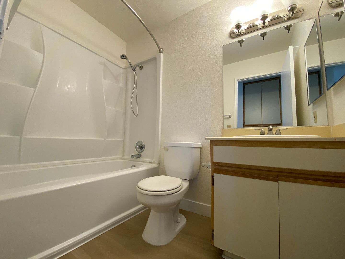 The bedroom is quite roomy as well and offers a large three-panel glass door closet!