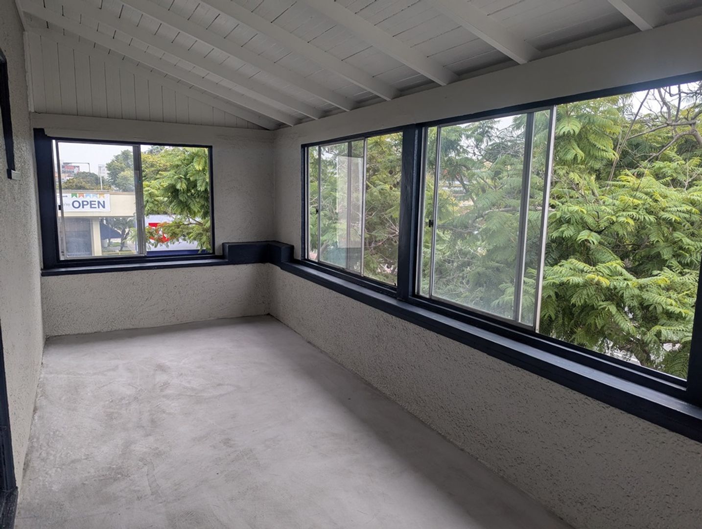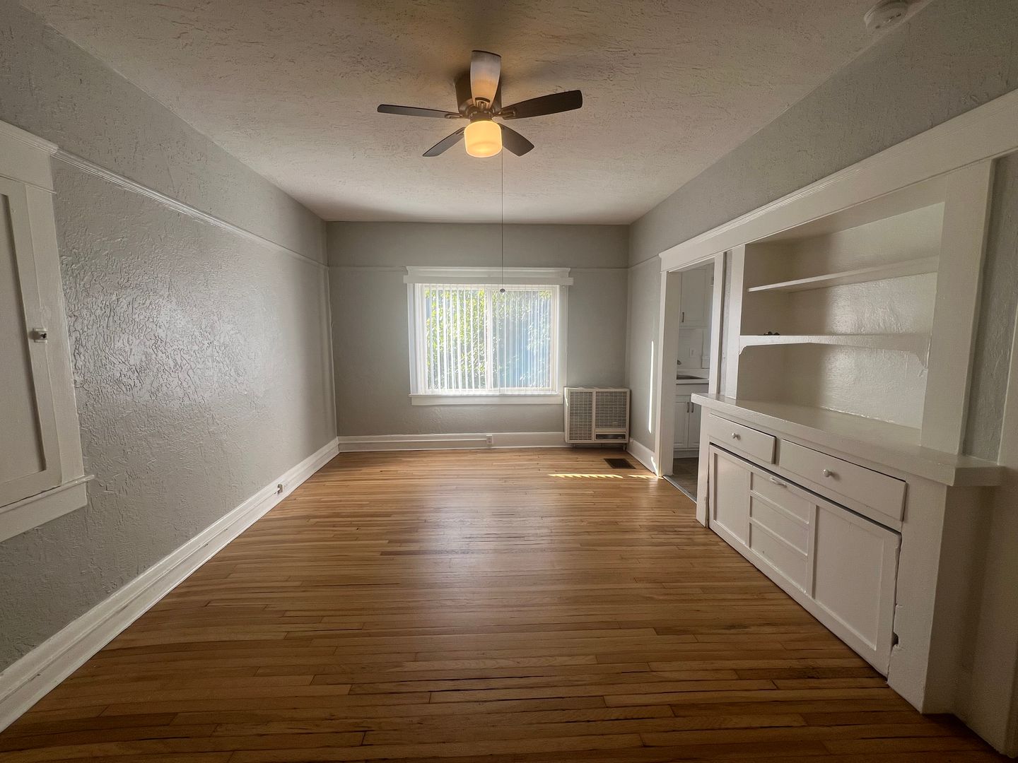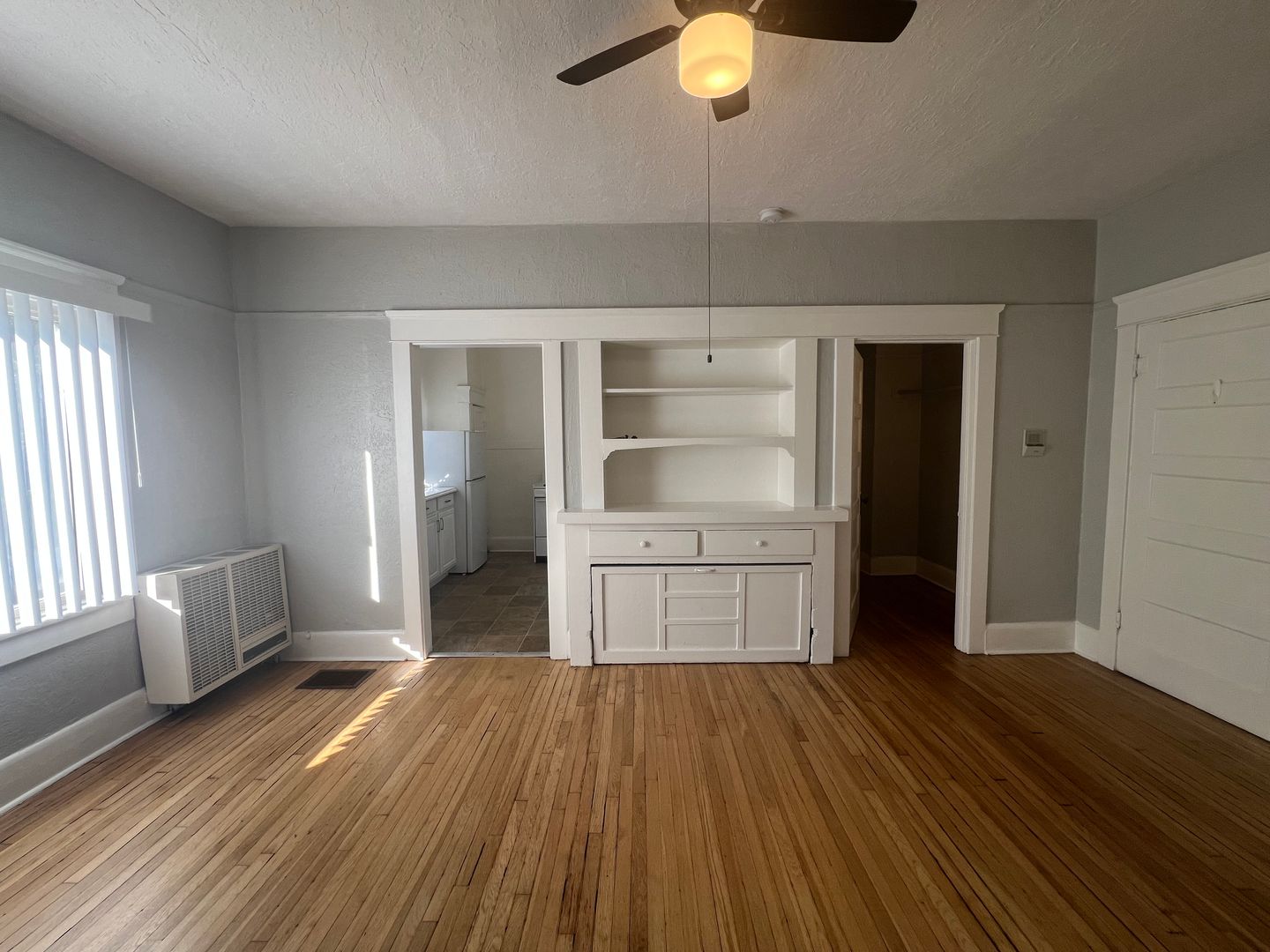 This studio offers a living/sleeping space that is large and offers a built-in wall unit for nick knacks, plants etc.