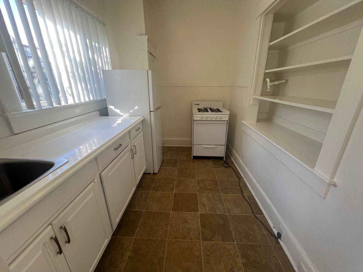 The kitchen offers generous counter space and has built in cabinets. Appliances include a refrigerator and stove.
