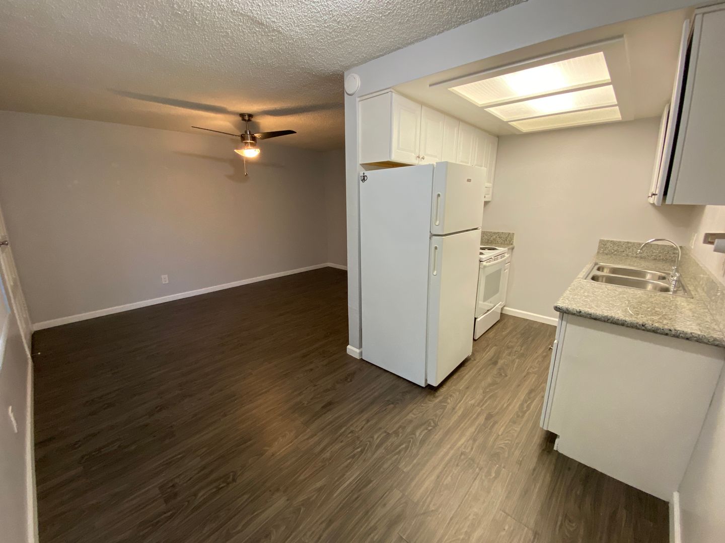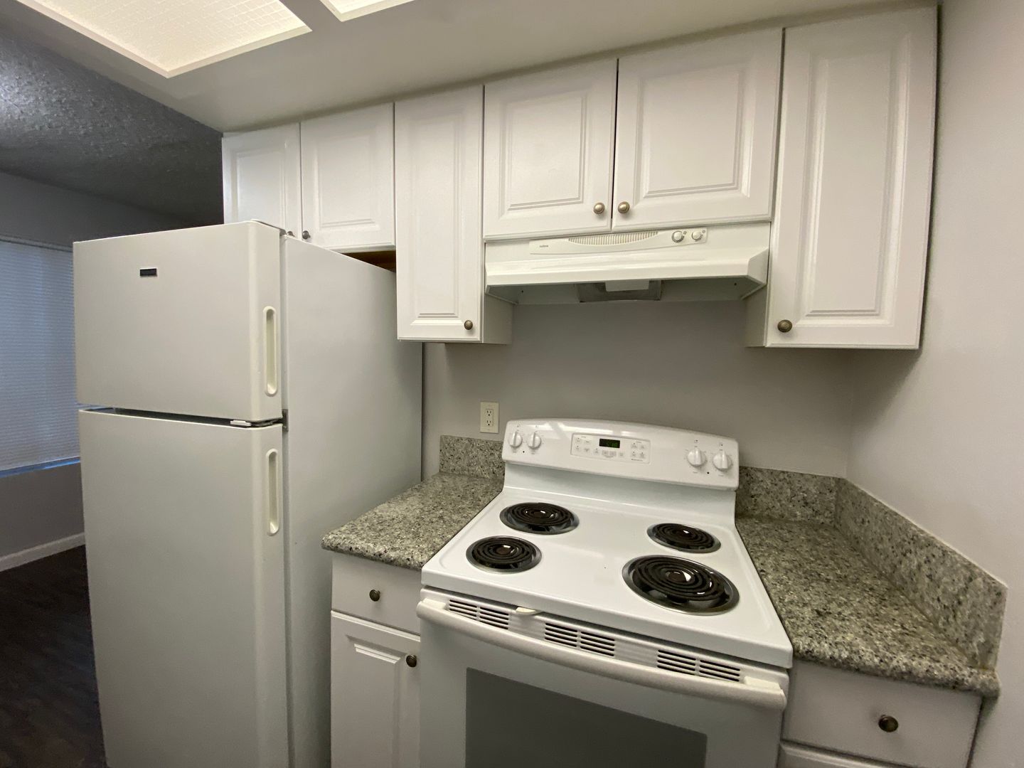 The kitchen offers upgraded counters, cabinets and fixtures. The appliances included are a stove and refrigerator. There is a nook for a dining table and chairs.