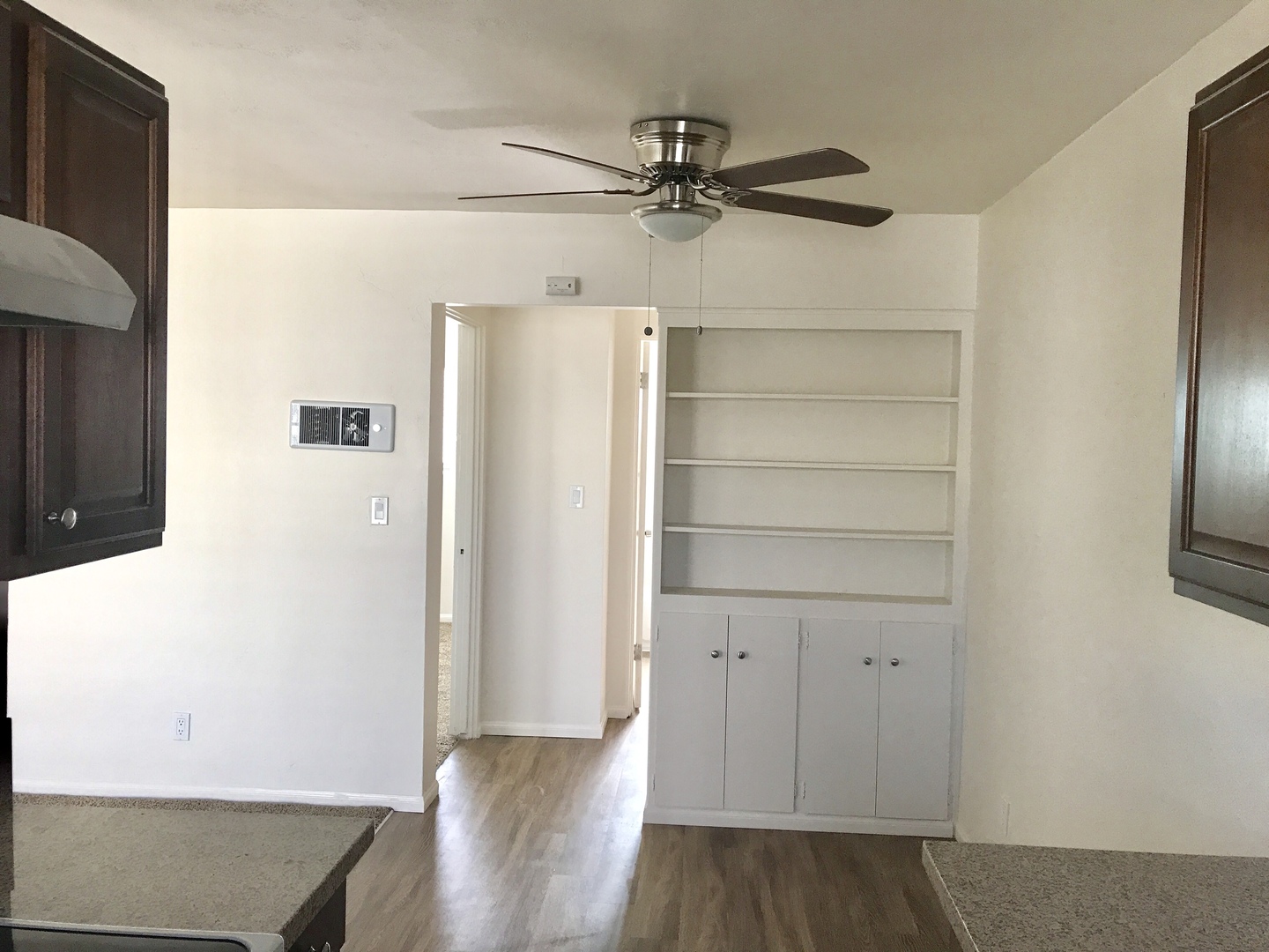 The living room features carpeting and opens up to the dining room which provides a ceiling fan and built in shelving for knick knacks. The dining area can comfortably fit a table and chairs.