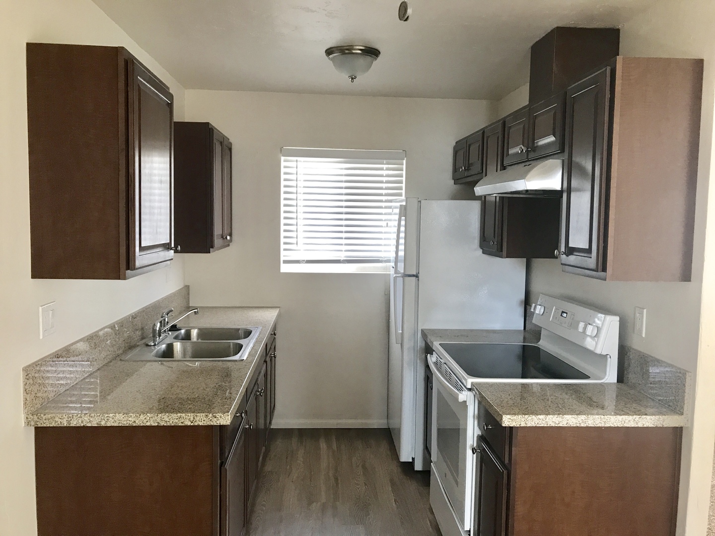 The kitchen offers granite counters, updated cabinets and flooring. The appliances include a stove/oven and refrigerator.