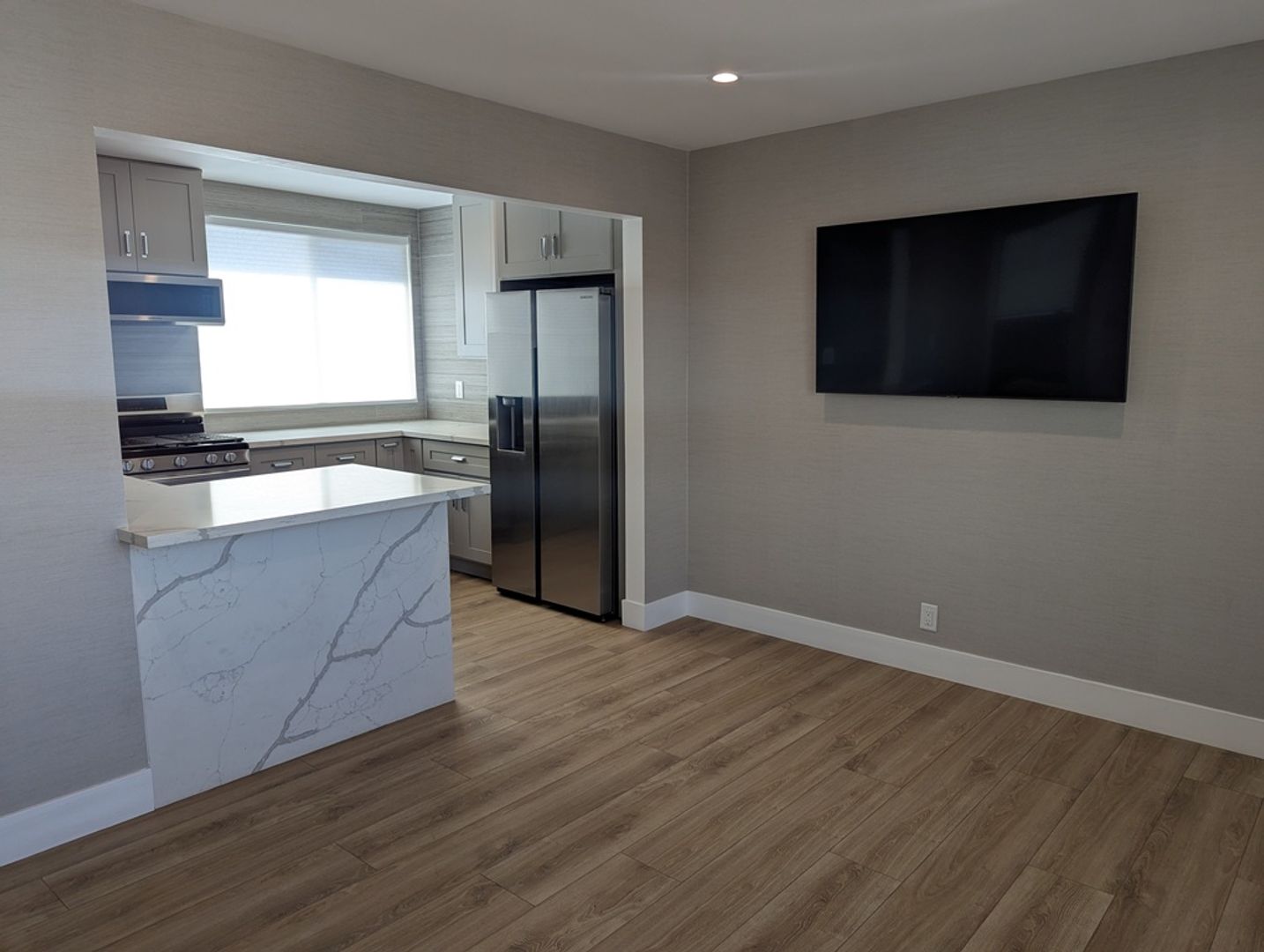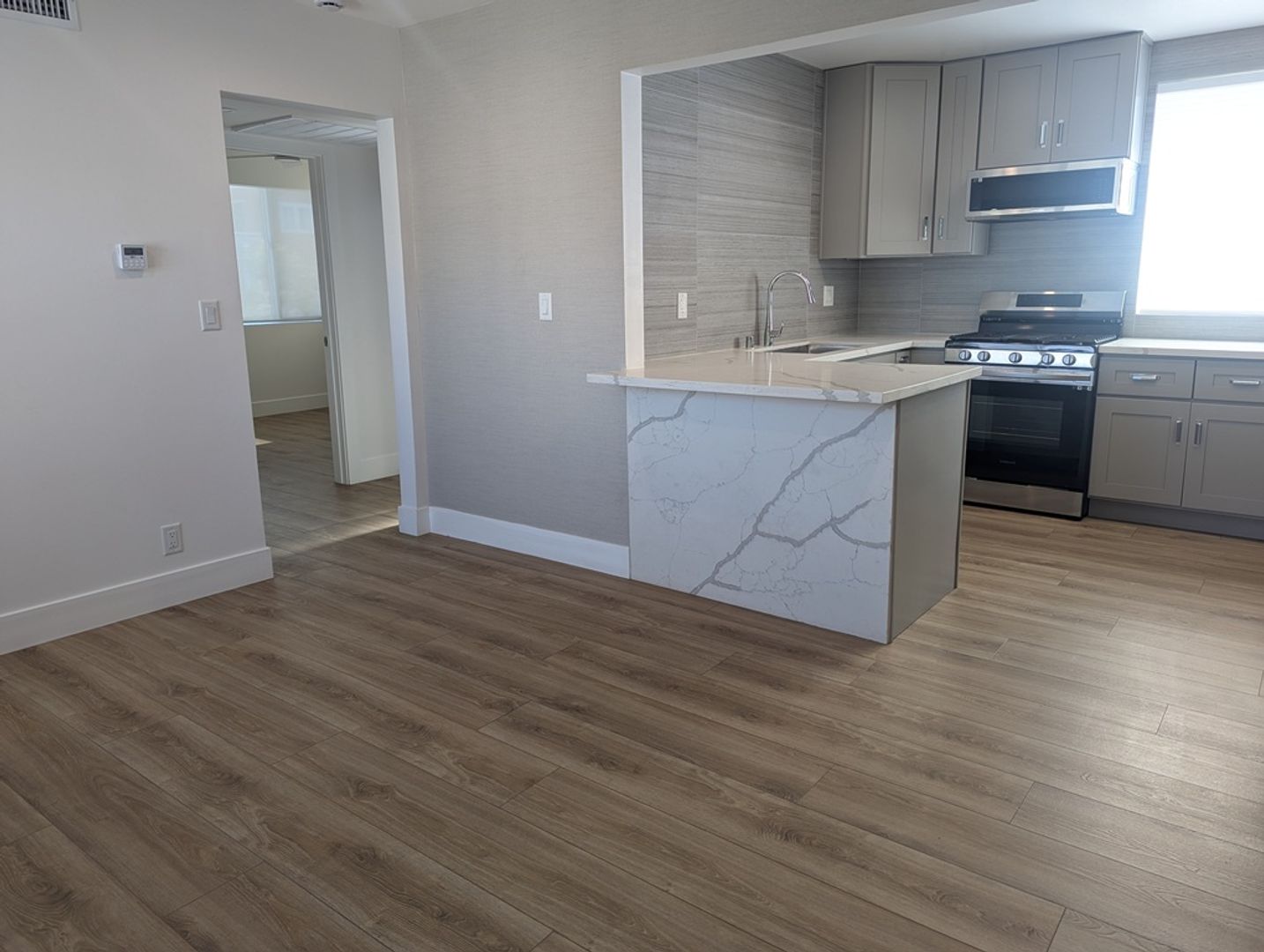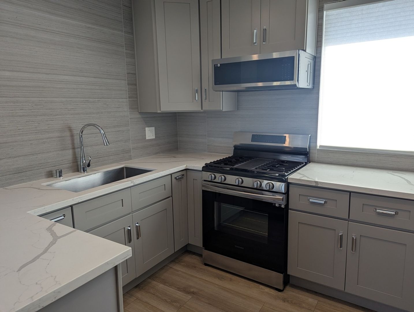 Enter into the warm modern living room with a large window for natural light. Warm neutral plank flooring throughout the unit. The kitchen boosts beautiful granite counters surrounded by abundant cabinets. The kitchen is equipped with a stainless steel appliance package which includes: stove/range, microwave, refrigerator, and dishwasher.