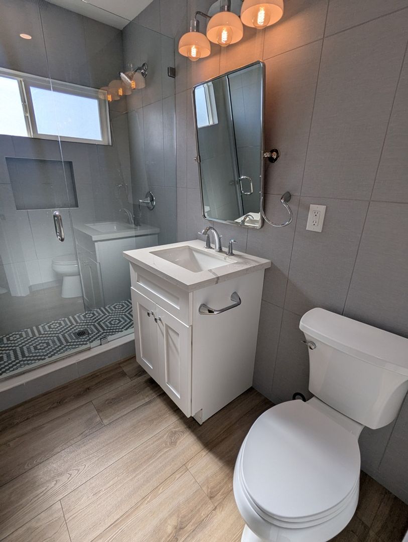 There are 2 bedrooms. The bathroom carries the warm colors into it with a granite top vanity and offers a beautiful glass standup shower (no tub) with tile.