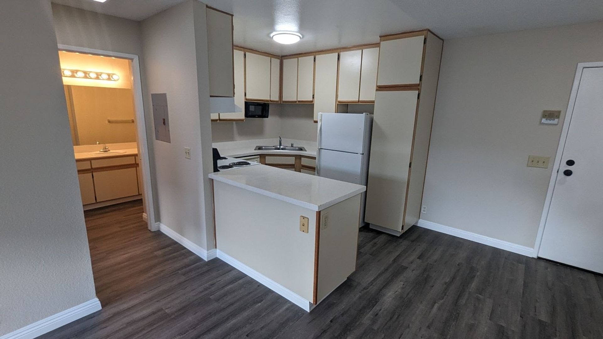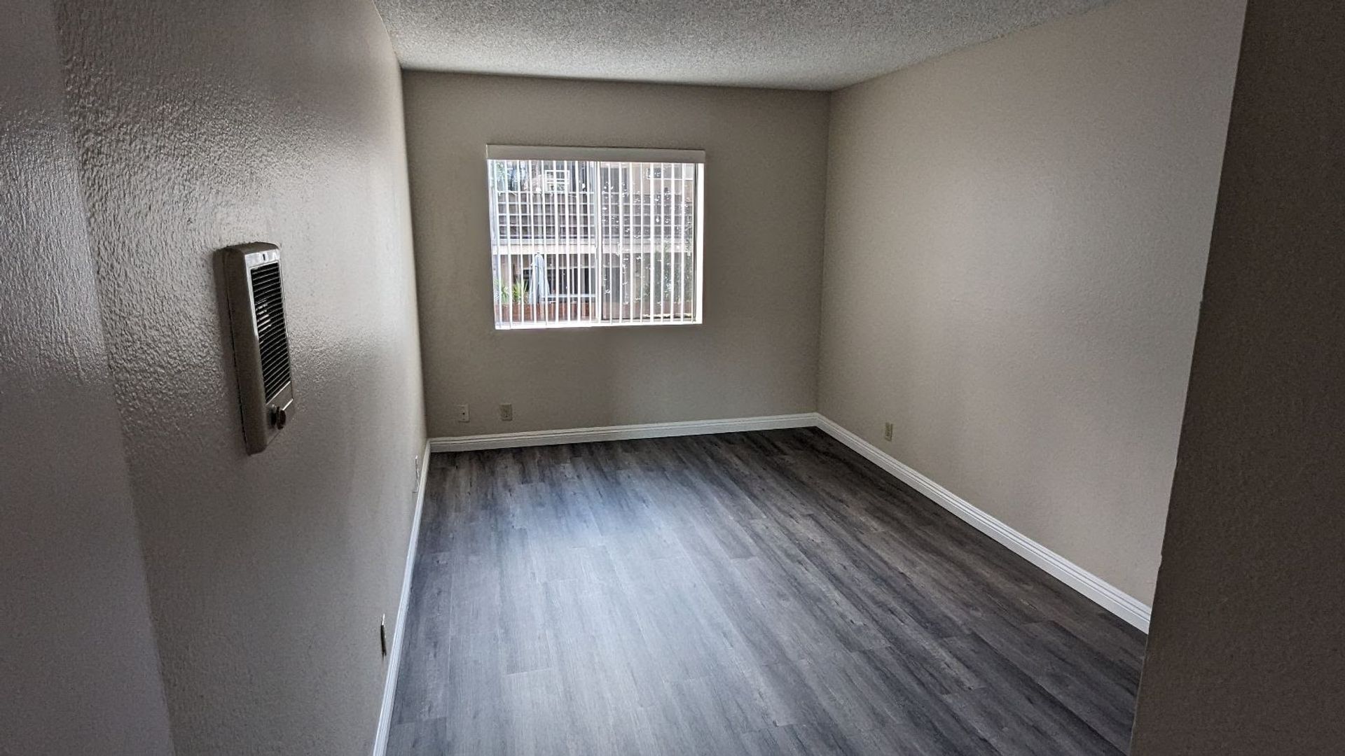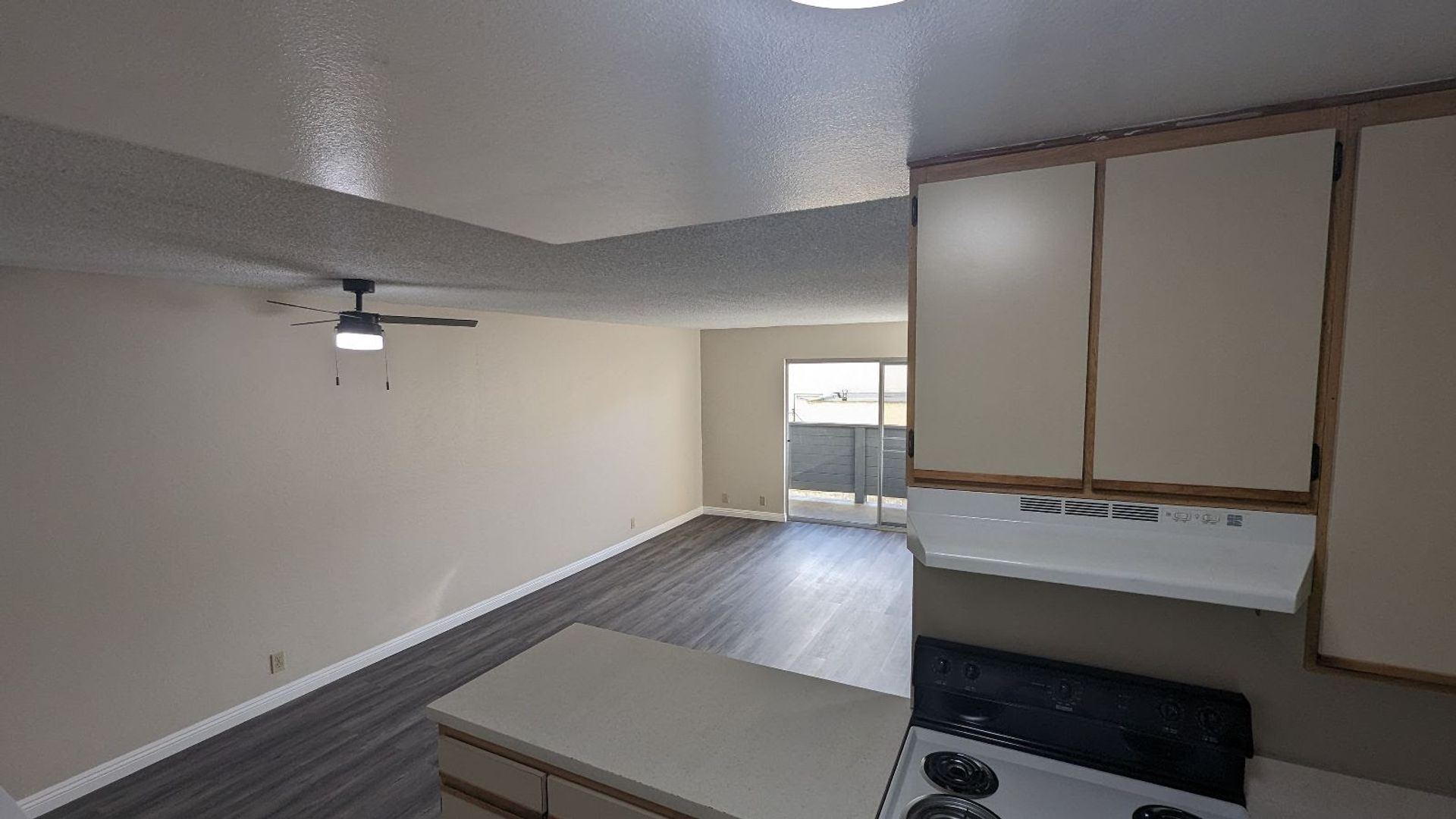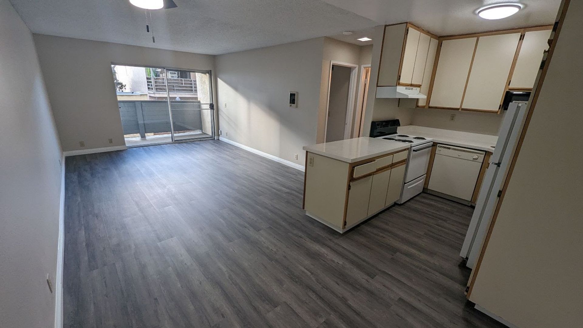 The very spacious living room will effortlessly fit over-sized furniture and a large screen TV with room to spare. There is a patio off the living room. There is easy clean newer plank flooring.