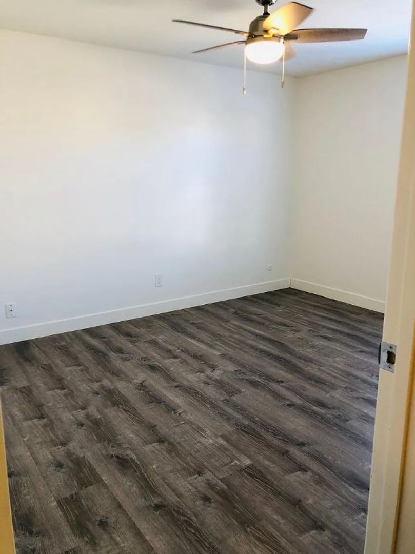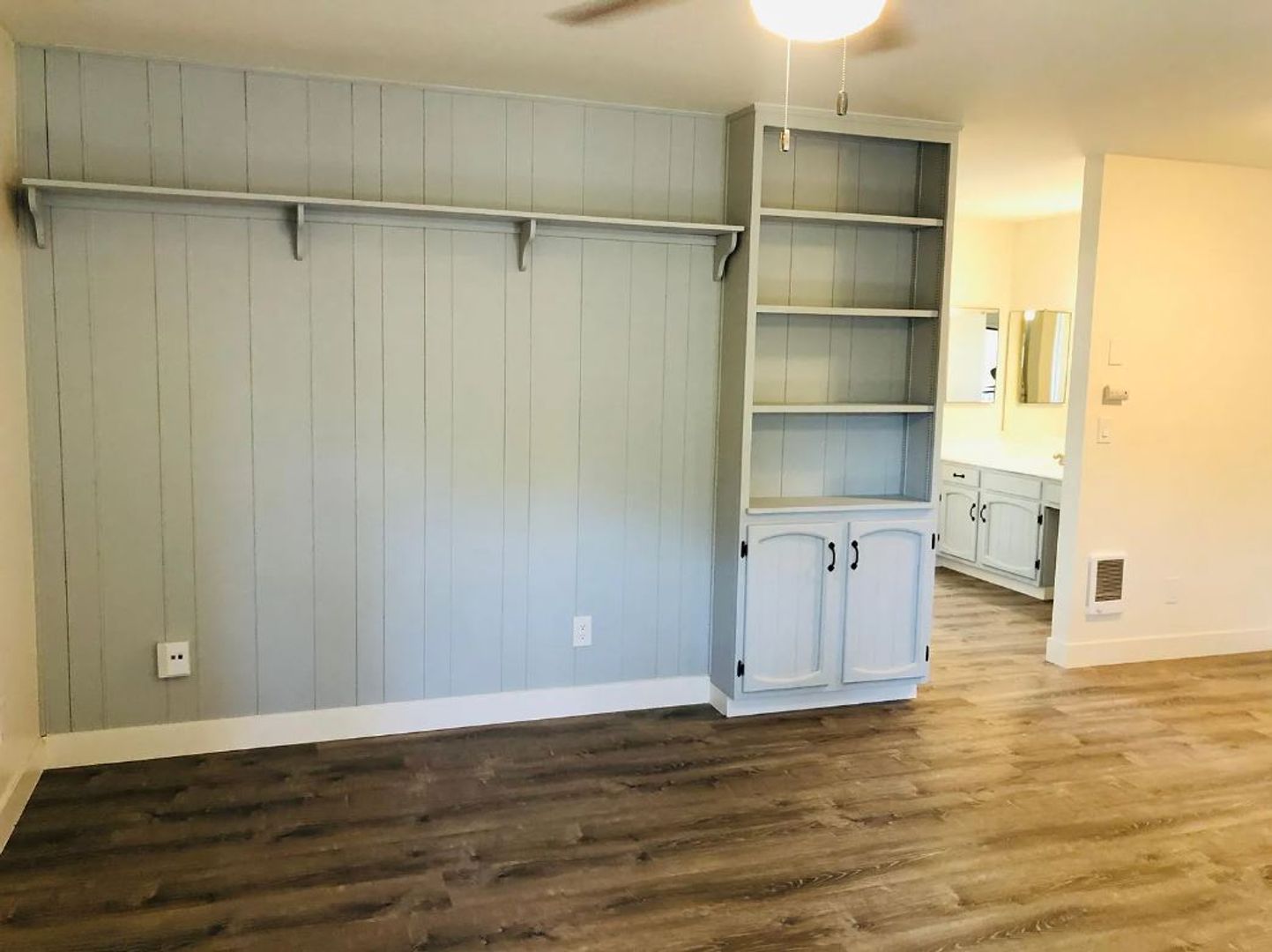 The bedroom easily fits a queen size bed with room to spare and is equipped with a ceiling fan.