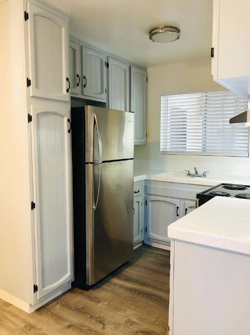 The kitchen has surrounding white cabinets providing ample storage and offers a stainless steel refrigerator and stove. The dining room is located just off the kitchen and can comfortably fit a table and chairs.