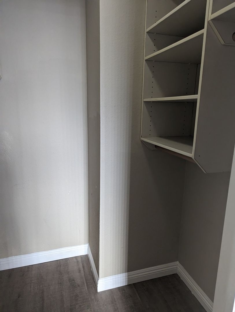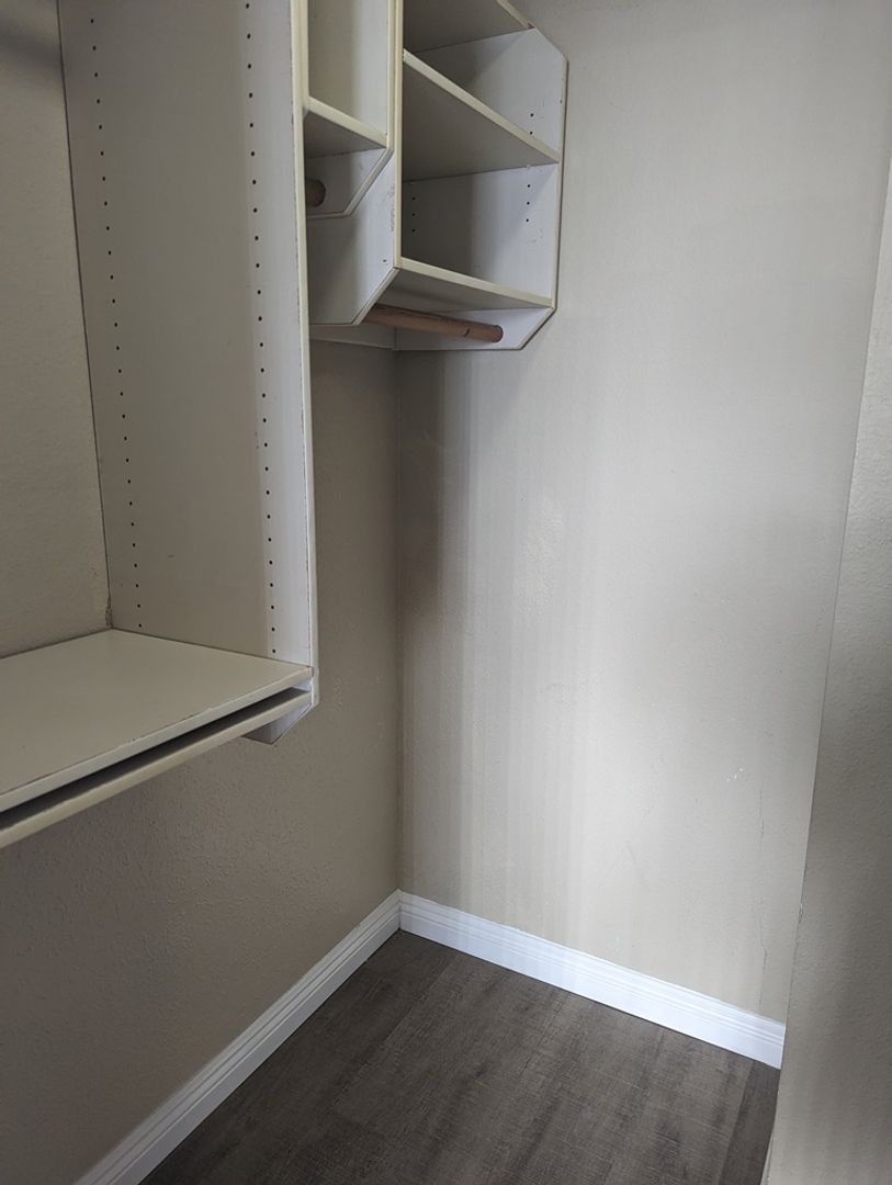 The bedroom is quite roomy as well and includes a walk in closet!